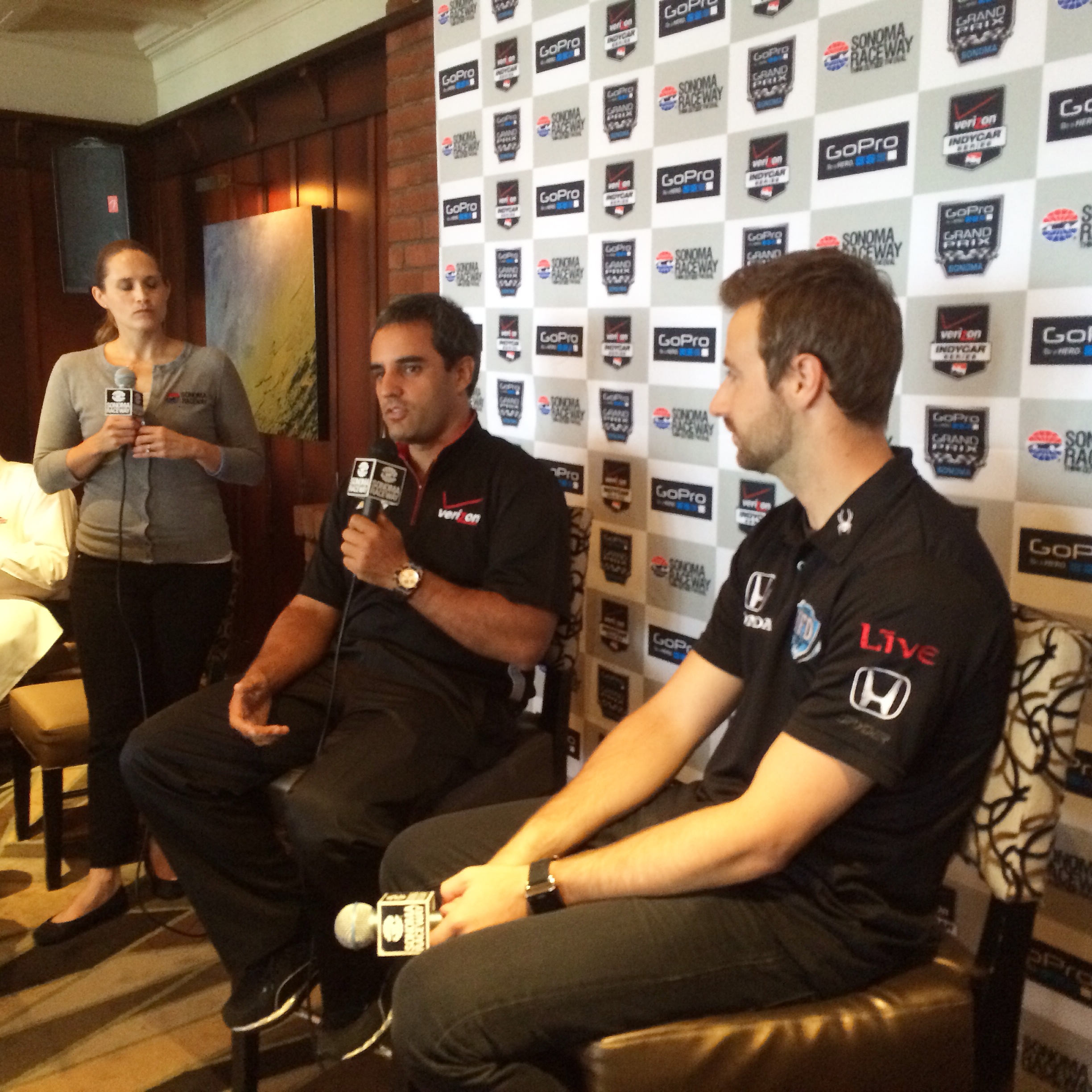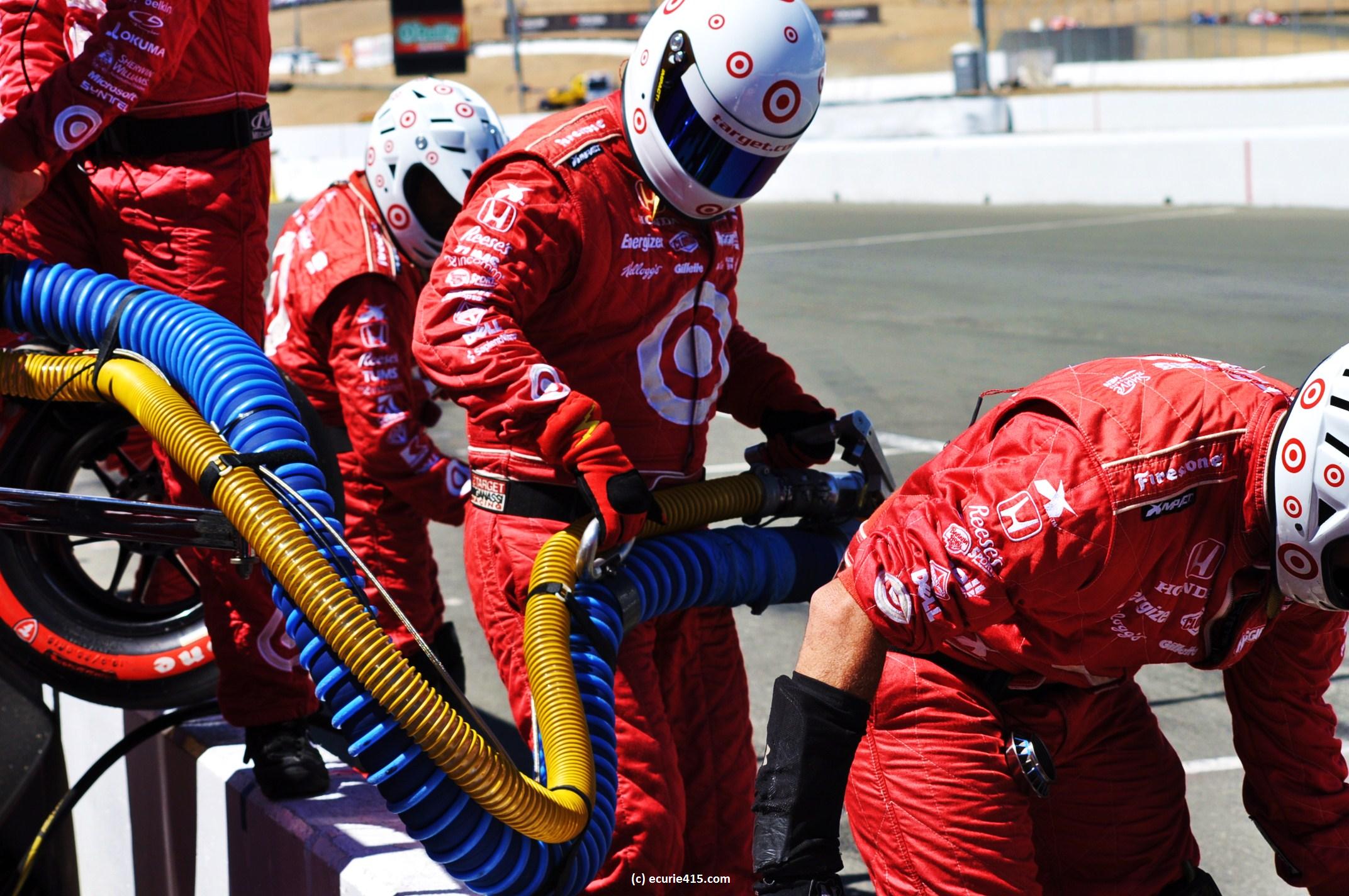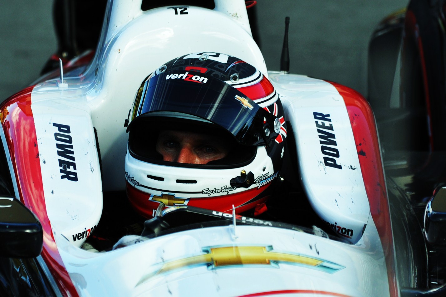 Team Penske’s Will Power and Juan Pablo Montoya come through early, Montoya carrying tremendous exit speed and the raw aggression that has won him races at Monaco, Indianapolis, and Daytona. Power shows more nuance but no less speed through the same complex. Castroneves isn’t far off from his stablemates. Then the Ganassi cars appear, Dixon and Kanaan just a blur in their red and white Target cars, fully dialed in. Although Power is the polesitter, Dixon and Kanaan look quick in morning warm up.
