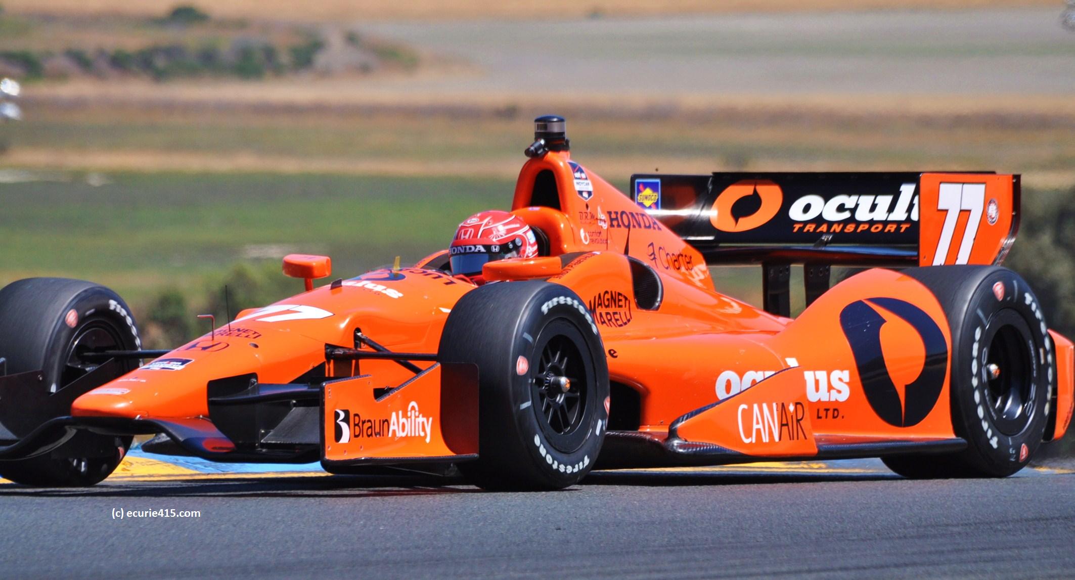 Then it’s time for the Andretti drivers to take on 3-3a. Hinchcliffe is slow getting out of the garage, but Ryan Hunter-Reay is in full attack mode. The engine coughs, sputters and blurps as Hunter-Reay bumps against the rev limiter, pushed beyond its limits by the aero load and the demands of the driver’s right foot. Gravity wants to send the car into the sky; locked in an eternal struggle with its opposite number, downforce, which wants to plant the car and compress the driver into his seat. The Firestone tires scream in anger, testing the limits of adhesion.
